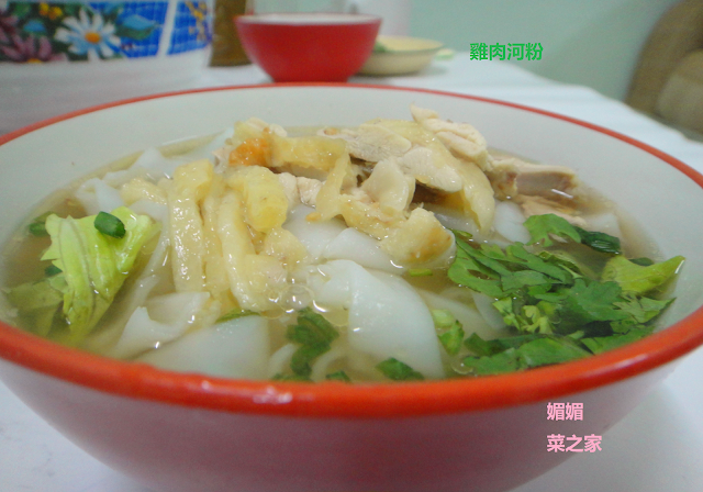 2、燒開一窩水,下一小匙鹽,然後把河粉稍微川燙,撈起滴乾水分置於碗中,在上面鋪下雞肉、青蔥末或香菜。